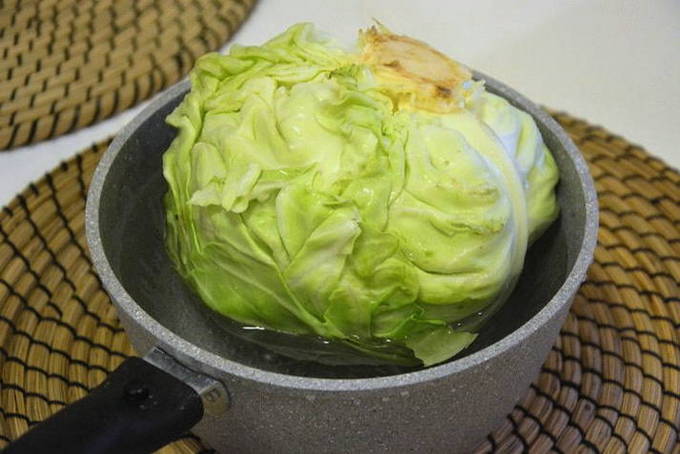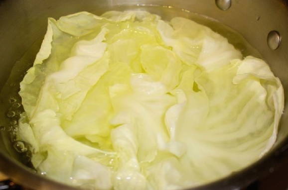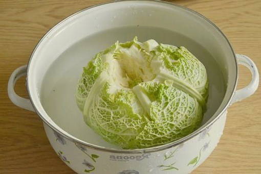 - Bij interactie met kool snijden we allereerst de stronk uit en scheiden de bladeren voorzichtig van het hoofd. Kook hele vellen in gezouten kokend water gedurende ongeveer 3-5 minuten voor zachtheid.