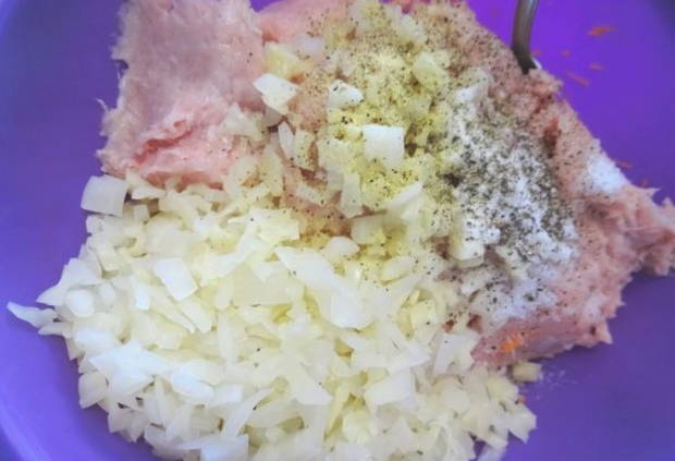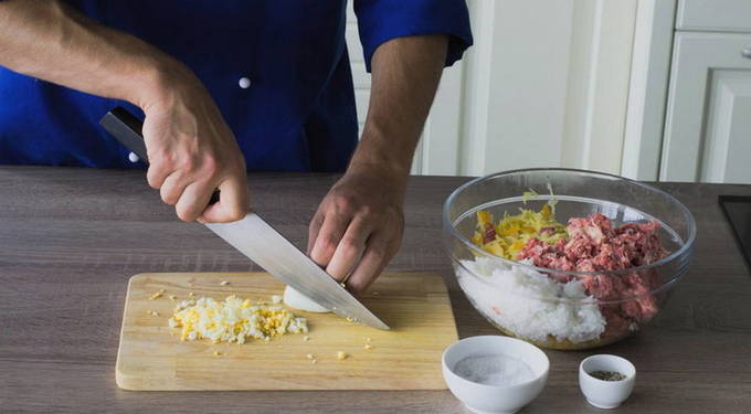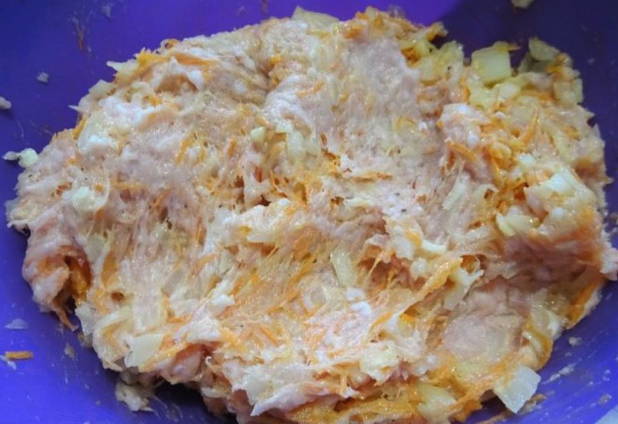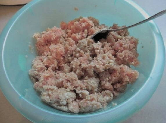 - Terwijl het graan afkoelt, draai je het gehakt door een vleesmolen en voeg je de gesnipperde ui, knoflook door de crusher, 200 milliliter water, zout en peper toe. Kneed alle ingrediënten grondig tot een gladde massa.