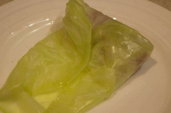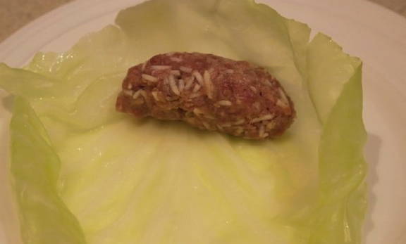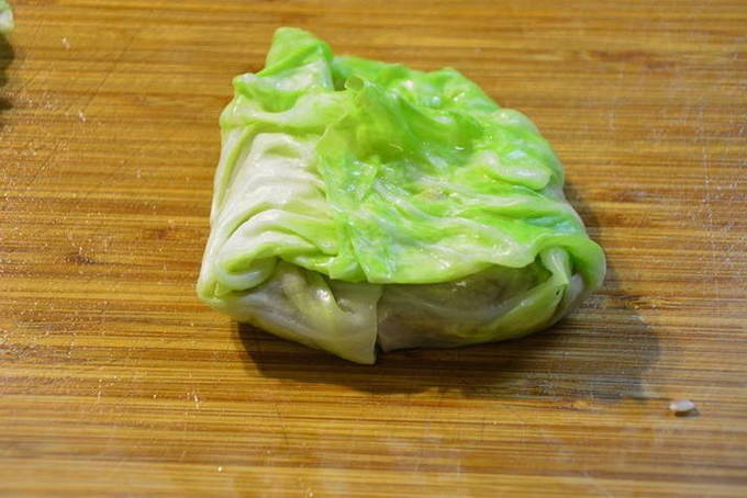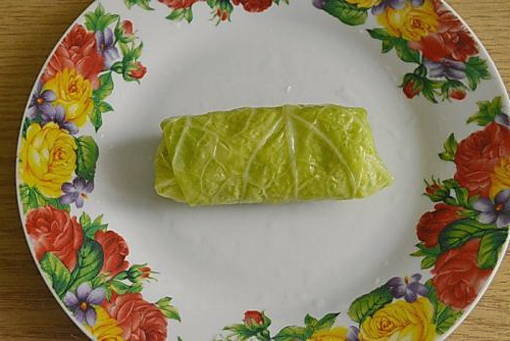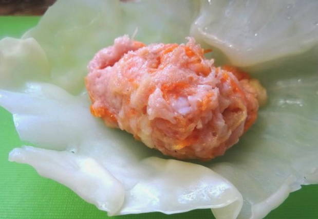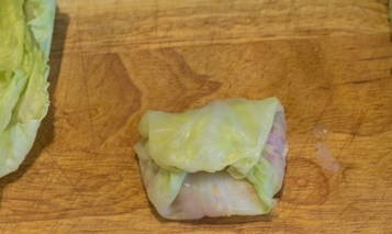 - Voor het vormen vormen we een kleine kotelet met natte handen, leggen deze op de basis van een koolblad en vormen een koolrol.