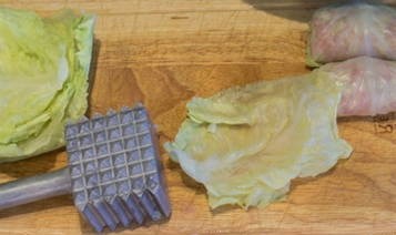 - Laten we beginnen met het vormen van koolrolletjes. Klop het harde deel van het koolblad lichtjes met een culinaire hamer om het zacht te maken.