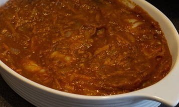 - Kneed de tomaten in hun eigen sap met een vork of onderbreek ze met een dompelblender voor uniformiteit en stuur ze naar de pan met andere groenten. Laat afgedekt op laag vuur ongeveer 10-12 minuten sudderen.