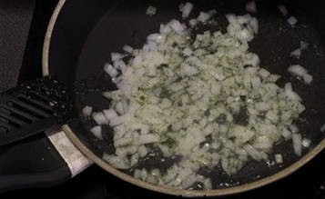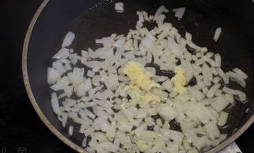 - Laten we de saus maken. Verhit een kleine hoeveelheid olie in een koekenpan en fruit hierin de gesnipperde ui en knoflook.