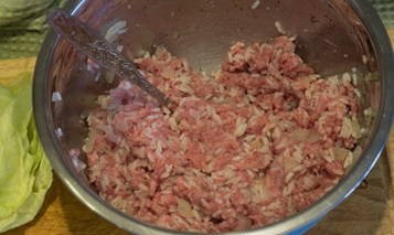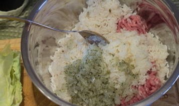 - Kook voor de vulling de rijst en voeg toe aan het kipgehakt. Voeg daar een theelepel zout en ¼ gemalen peper toe - meng alle ingrediënten goed.