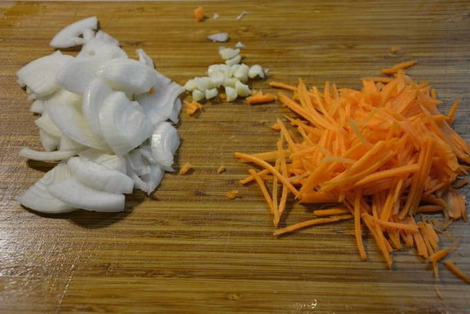 - Snijd voor de saus en vulling de ui en rasp de wortelen.