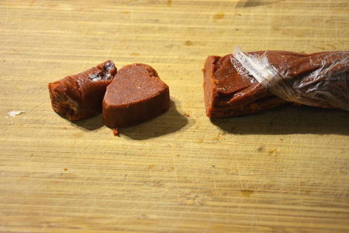 - We draaien de vulling in het vel lichtjes, vormen een rol en bedekken dan dezelfde rol met één uitstekende kant.