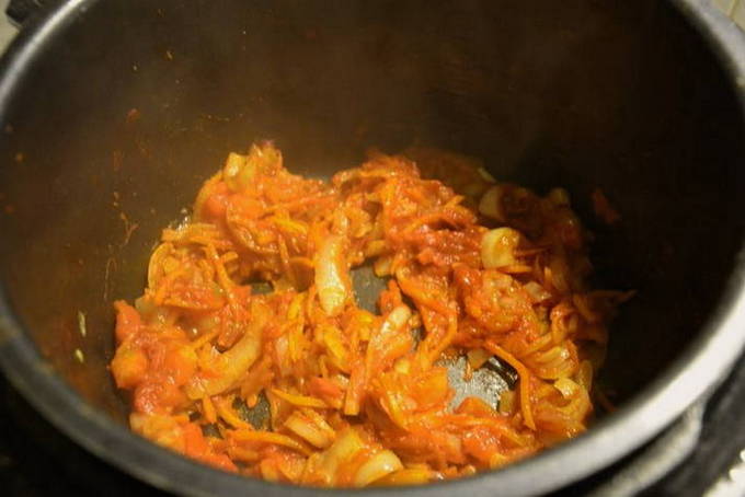 We wassen de rijst meerdere keren grondig in water en sturen het naar het gehakt, voegen twee eetlepels tomatenpuree toe en roeren opnieuw.