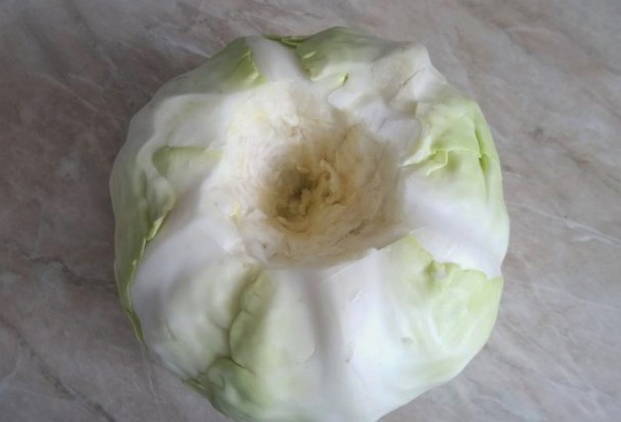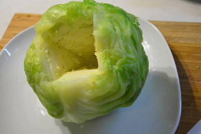 - Je moet zorgvuldig kool kiezen voor het maken van gevulde kool: kies geen overrijpe koolkop, met knapperige bladeren. We wassen de groente grondig en snijden voorzichtig de stronk weg, zodat de bladeren gemakkelijk loskomen.