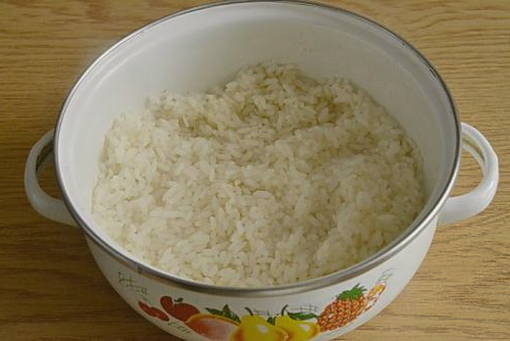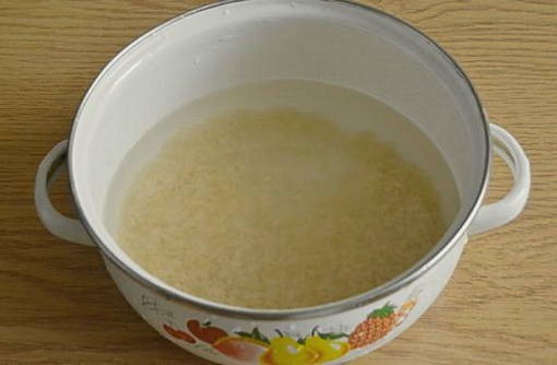 - Laten we beginnen met vullen. Kook een glas gewassen rijst tot het half gaar is.
