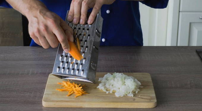 - Voeg de op een grove rasp geraspte wortel toe aan de doorschijnende ui en bak de groenten in ongeveer 10 minuten zacht.