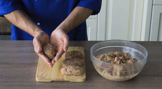 - Laten we warm beginnen te vormen. Vorm met natte handen een kleine langwerpige kotelet en verdeel deze over een deel van een koolblad.