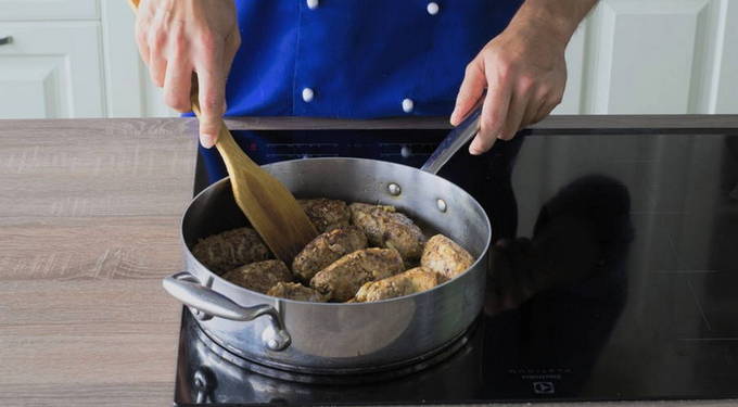 - Als alle broodjes klaar zijn, doe je ze in een voorverwarmde pan en bak je de tonnen lichtbruin. Dit doen we zodat de werkstukken dichter worden en hun vorm beter behouden.