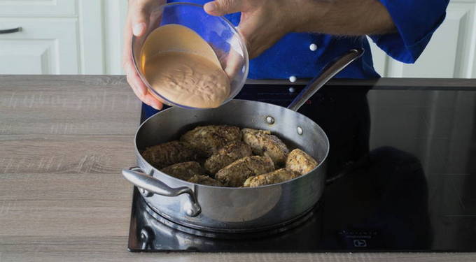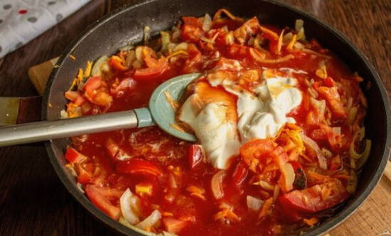 - Verdun de zure room met gefilterd water en giet het over de gebruinde groenten, laat nog een paar minuten op laag vuur sudderen.
