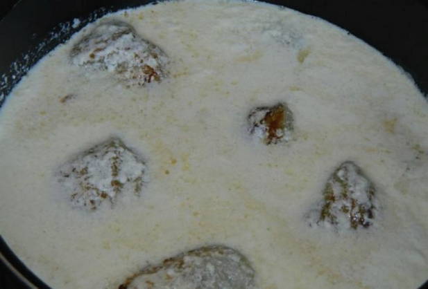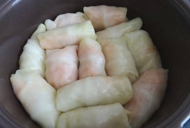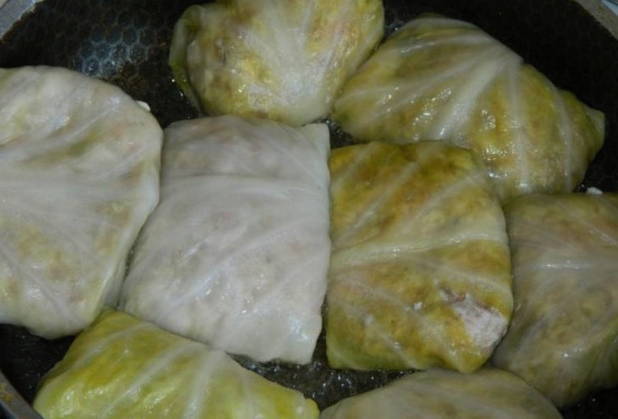 - Wanneer de koolrolletjes een gouden kleur krijgen, breng ze dan voorzichtig over naar de saus en laat ze koken. Daarna verminderen we het vuur en laten we het ongeveer 20-25 minuten onder het deksel sudderen.