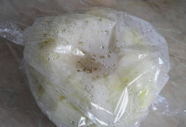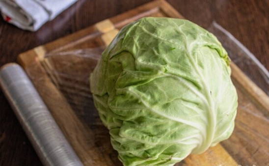 - Laten we de kool klaarmaken. Om ervoor te zorgen dat de bladeren gemakkelijk van de kool kunnen worden verwijderd en de gewenste zachtheid hebben, wikkelen we de kool in huishoudfolie en sturen deze 2-3 minuten op vol vermogen naar de magnetron.