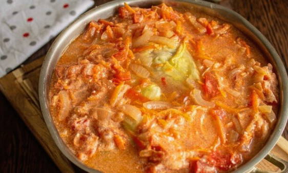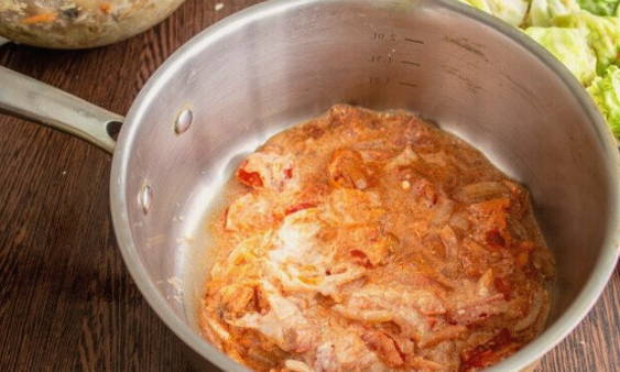 - Laten we een saus bereiden waarin alles wordt gestoofd. Om het in een diepe schaal te bereiden, combineer je de kaputa-bouillon, tomatenpuree, zure room, breng je op smaak en meng je goed. We brengen de gevulde kool over in een koekenpan met hoge zijkanten (het is goed als er twee lagen zijn) en vullen deze met de resulterende saus. Koken onder het deksel gedurende een half uur na het koken op middelhoog vuur.