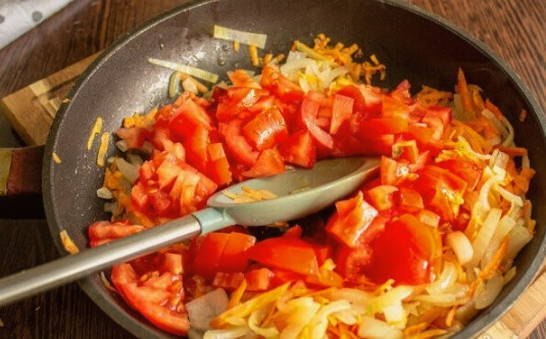 - Voeg de in blokjes gesneden tomaten toe aan de wortelen en uien en kook nog ongeveer 5 minuten.