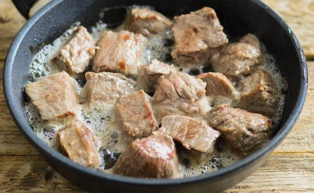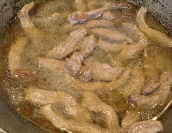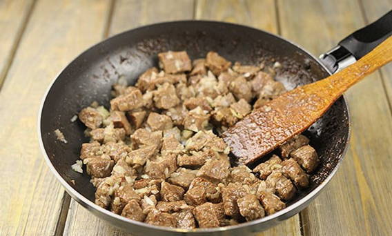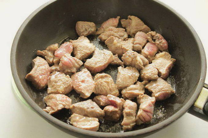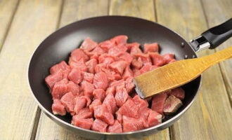 - Snijd het rundvlees in kleine stukjes en bak het in hete plantaardige olie.