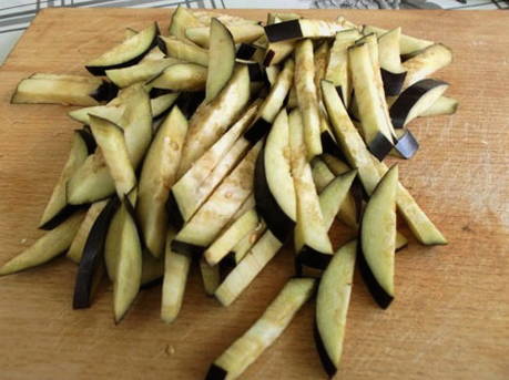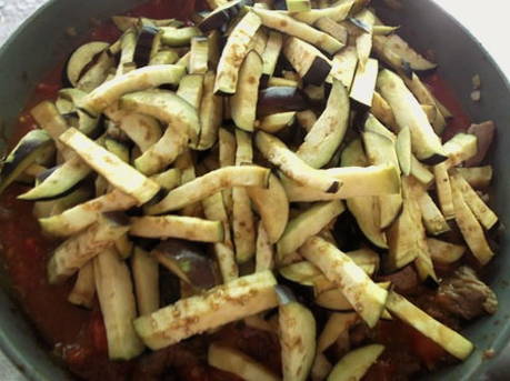 - We verspreiden de aubergines over het vlees en laten alles 20 minuten onder het deksel sudderen.