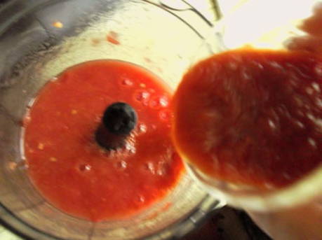 - Blancheer de tomaten, snij vervolgens een tomaat in blokjes en hak de rest met een blender in aardappelpuree en meng met tomatensap.