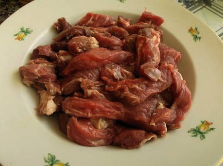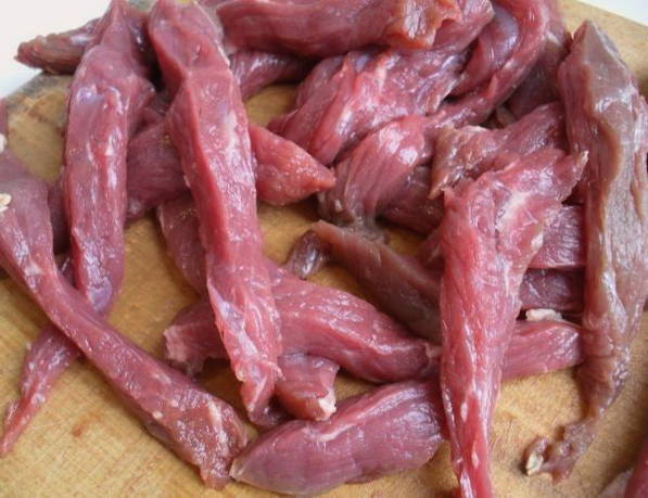 - Spoel het vlees goed af en snijd het in lange repen.