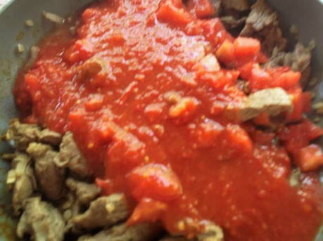 - Voeg vervolgens de tomaten toe in hun eigen sap.