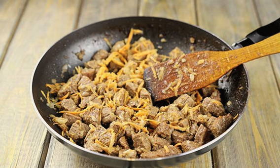 - Haal de groenten uit de pan, verhit de rest van de olie erop en leg het gemarineerde vlees erin. Roer, bak het vlees goudbruin.