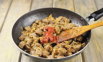 Voeg bloem toe, meng snel alle ingrediënten en bak ze ongeveer een minuut, voeg dan de tomatenpuree toe.