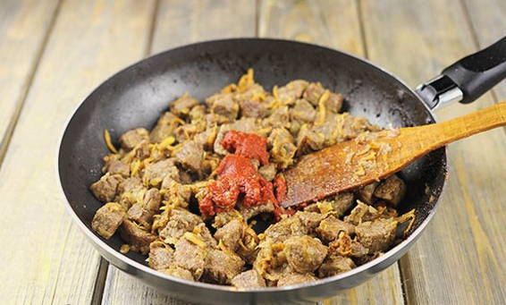Bak het vlees, af en toe roerend, goudbruin en voeg dan de gesnipperde uien toe aan de pan.