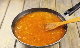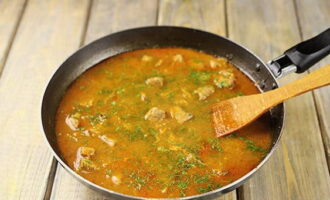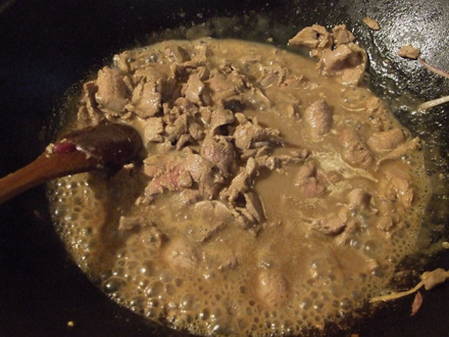 - Vul het vlees met bouillon, breng het aan de kook en kook al roerend tot de saus dikker wordt.