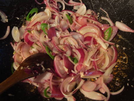 - Snijd de ui in vieren en bak in een pan tot ze goudbruin zijn en leg ze dan bij het vlees.