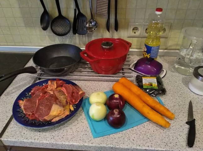 - Wij bereiden alle ingrediënten voor. We wassen en drogen het vlees, wassen en reinigen de knoflook, wortelen en uien.