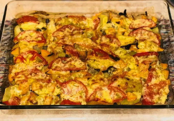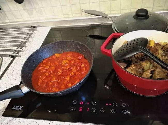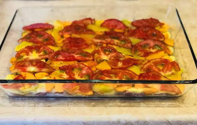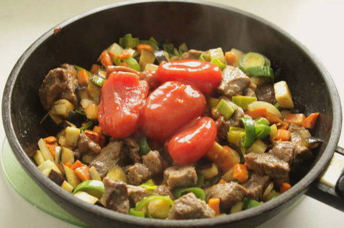 - We leggen het rundvlees met uien in een ovenschaal, leggen er lagen aardappelen, wortelen, paprika's en tomaten op en sturen ze een half uur naar een voorverwarmde oven op 180 graden.