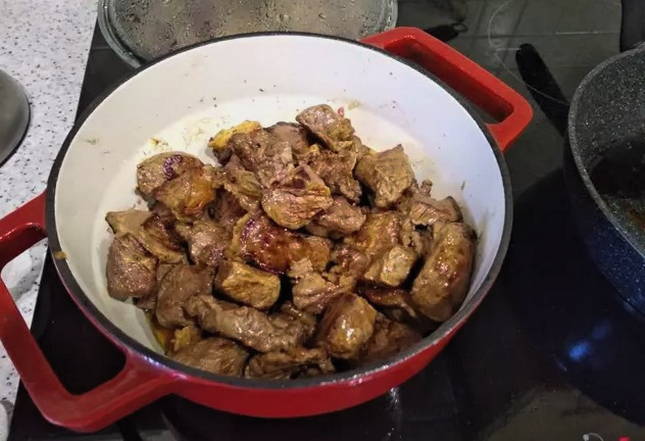 - Bak het vlees in een pan goudbruin.