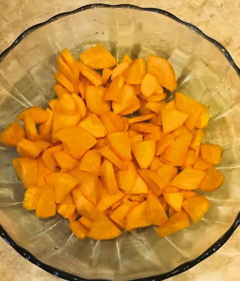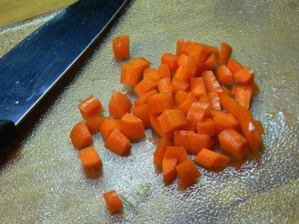 - We schillen ook de wortelen, spoelen en snijden in kleine blokjes.