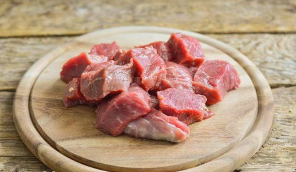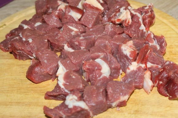 - Snijd het rundvlees in kleine blokjes.