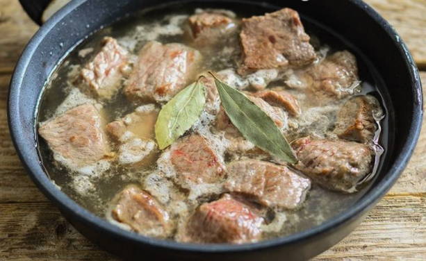 - Giet water in de pan zodat het vlees volledig bedekt is. Voeg laurier en paprika toe en laat het vlees een uur op laag vuur sudderen, waarbij u regelmatig water toevoegt.