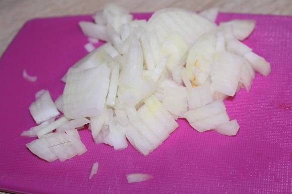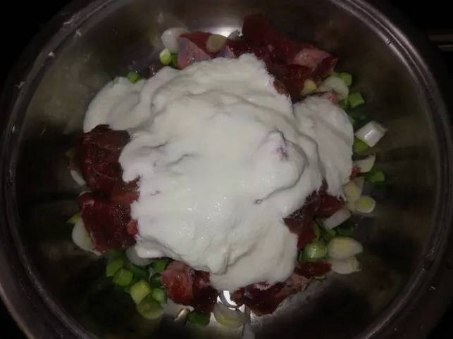 - Snijd het rundvlees in kleine stukjes, vul het met kefir, voeg de ui, peper en zout toe, in halve ringen gesneden en laat het een uur in de koelkast marineren.