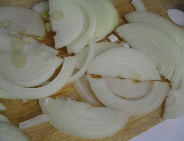 - Pel de ui en snij in halve ringen.