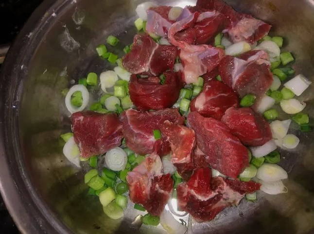 - We wassen en hakken het vlees en de uien. Doe de ui in een diepe braadpan, leg het vlees erop.