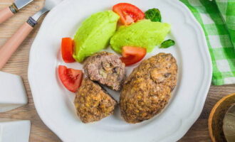 - Voeg 10 minuten voor de bereiding uien en champignons toe aan het vlees, meng en breng tot gereedheid.