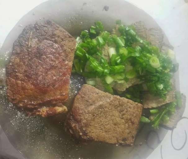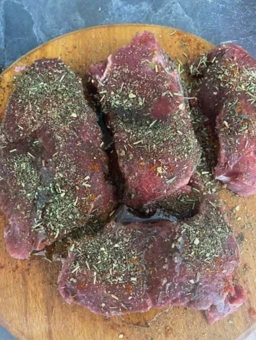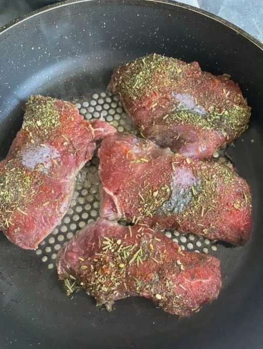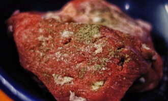 - Was het vlees goed en dep droog met keukenpapier, verwijder de films en snijd in kleine stukjes, je kunt er lichtjes op kloppen met een hamer. Breng op smaak met zout, kruiden en zwarte peper. Wrijf goed in het vlees.