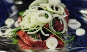 Op de bodem van de schaal waarin je het vlees gaat bakken, leg je de folie in meerdere lagen. Leg vervolgens het vlees neer. Pel de uien en snij in ringen. Was en droog dragon, munt en pruimen. Leg greens, pruimen en uien op het vlees.