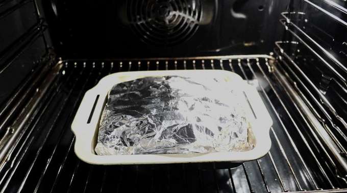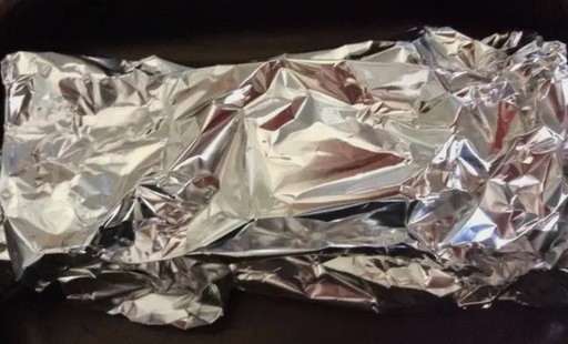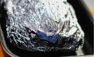 - Verpak stevig in folie verpakt in meerdere lagen. Zorg dat alles verzegeld is. Zet de vorm in de oven en bak de schaal 60-70 minuten op 180 graden.