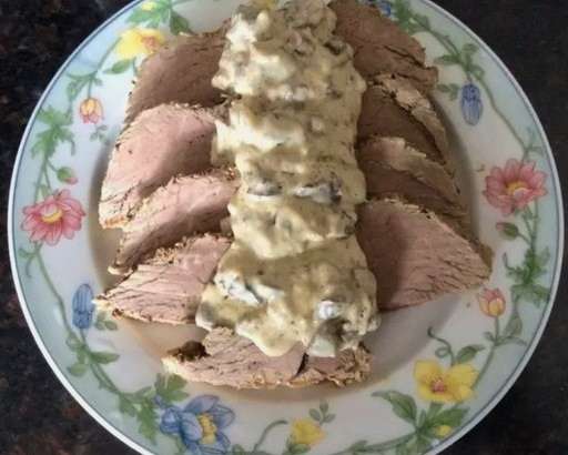 - Delicaat rundervarken gebakken in folie in de oven, in dunne plakjes gesneden, op een schaal gelegd en geserveerd. Daarnaast kun je de saus serveren. Varkensvlees past goed bij romige champignonsaus.