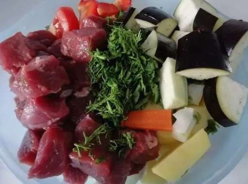 - Was, droog en snijd het vlees in blokjes. Pel de uien. Was wortelen en aardappelen, schil met een dunschiller. Aubergines, kruiden en tomaten wassen. Paprika's wassen, schillen van zaden en kern. Hak de groenten grof en hak de kruiden.