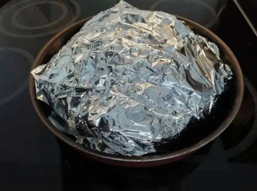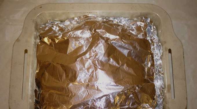 - Op de bodem van de schaal waarin je het vlees gaat bakken, leg je de folie in meerdere lagen. Leg vervolgens het vlees neer.