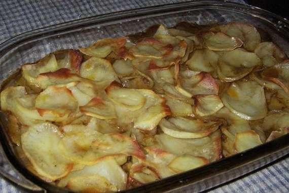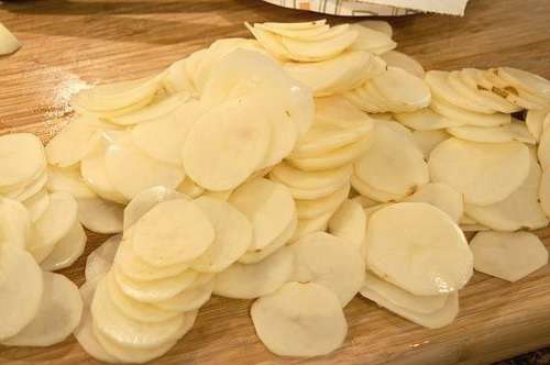 - Was de aardappelen, schil ze met een dunschiller. Snijd de geschilde aardappelen in dunne plakjes en zout.