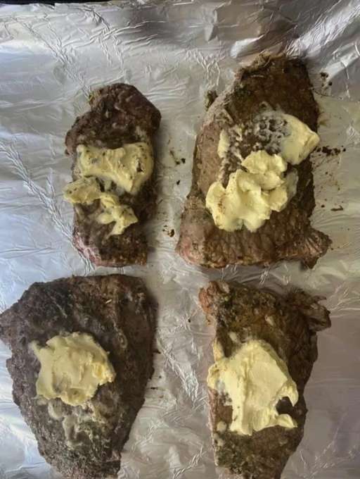 - Bekleed een bakplaat met folie en bekleed de gebakken biefstukken. Leg op elk plakje zachte boter. Wikkel het rundvlees stevig in folie gewikkeld in meerdere lagen. Plaats de bakplaat in de oven en braad het vlees gedurende 15 minuten op maximale temperatuur.