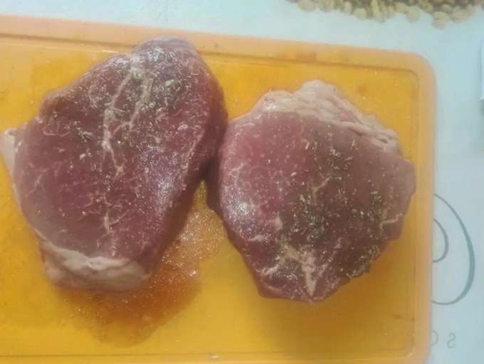 - Was het vlees goed en dep droog met keukenpapier, verwijder de films. Voeg zout, kruiden en zwarte peper toe. Wrijf de kruiden in het vlees en marineer gedurende 20 minuten.