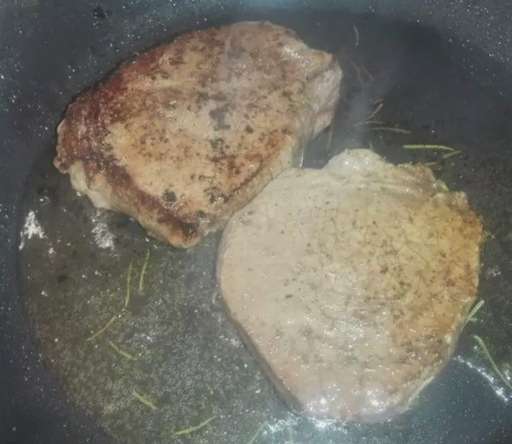 - Verhit de pan goed, voeg wat plantaardige olie toe, doe het voorbereide rundvlees en rozemarijn. Bak aan beide kanten goudbruin op middelhoog vuur.